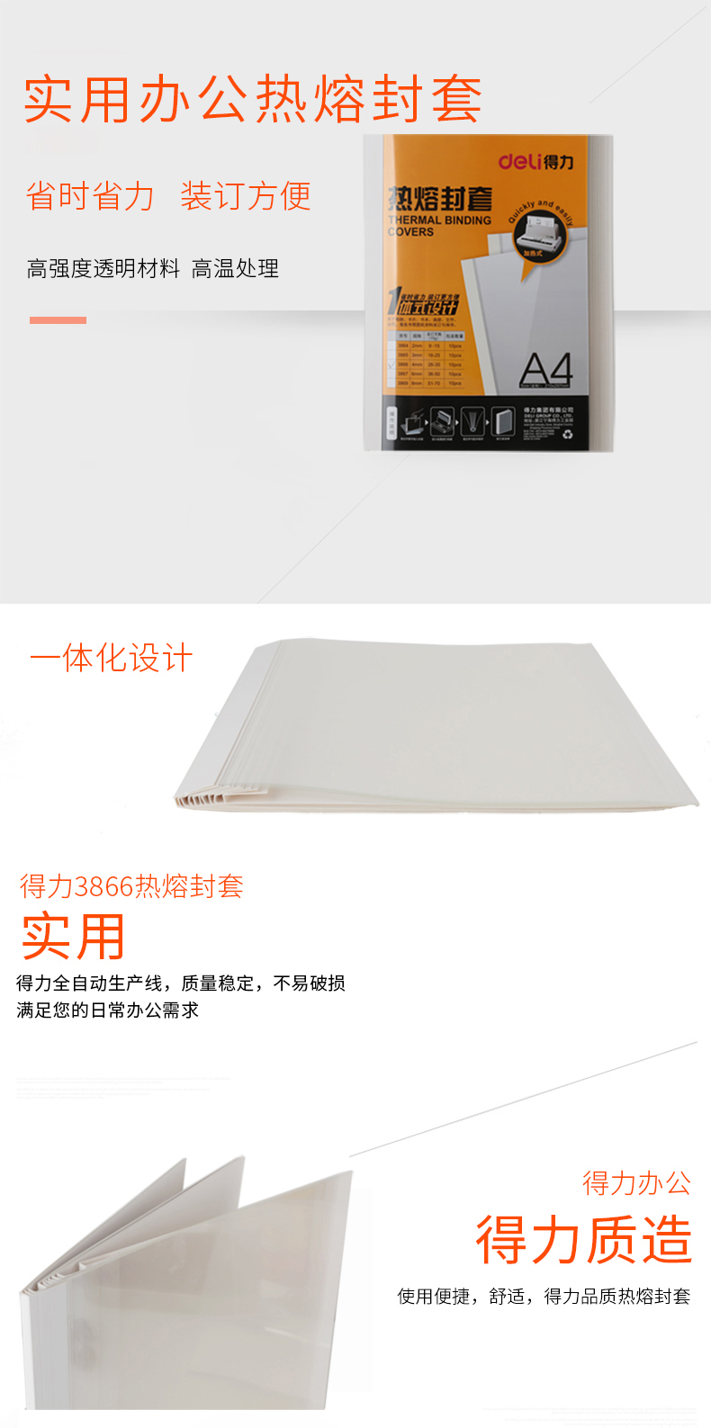 得力(deli) 热熔装订机专用塑料封套 A4胶装透明封面 装订合同标书纸质封皮 4mm 26-35页 3866