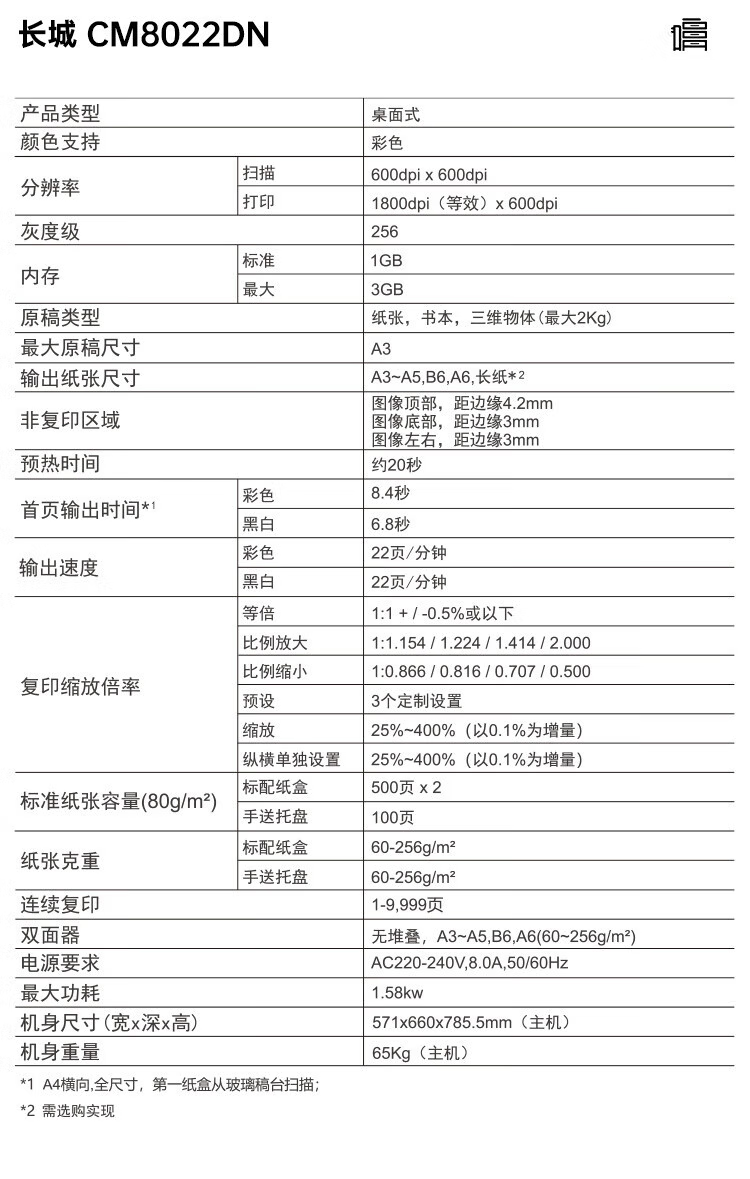 长城/GreatWall CM8022DN 多功能一体机 A3彩色激光打印复印一体机 (双面输稿器+双层纸盒)