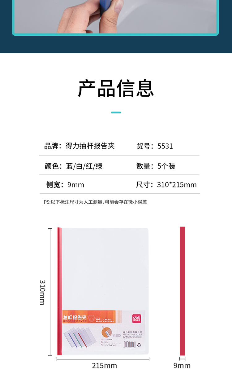 得力 deli DL 5531 文件夹 A4彩色抽杆夹文件夹拉杆夹