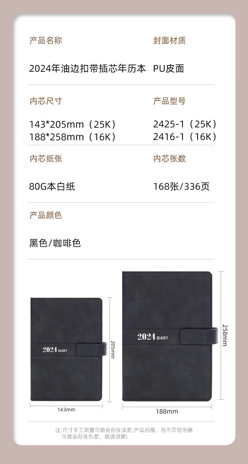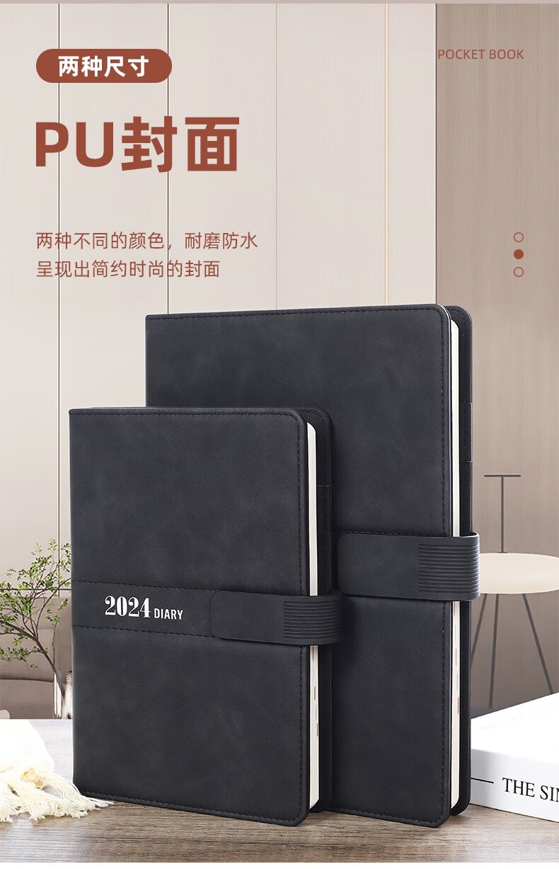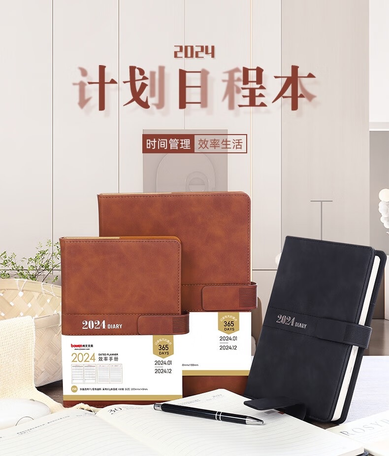 博文 2416-1 薄本册 2024年带扣皮套年历本计划本日程本效率手册365天记事本每日时间轴笔记本子 16k黑色