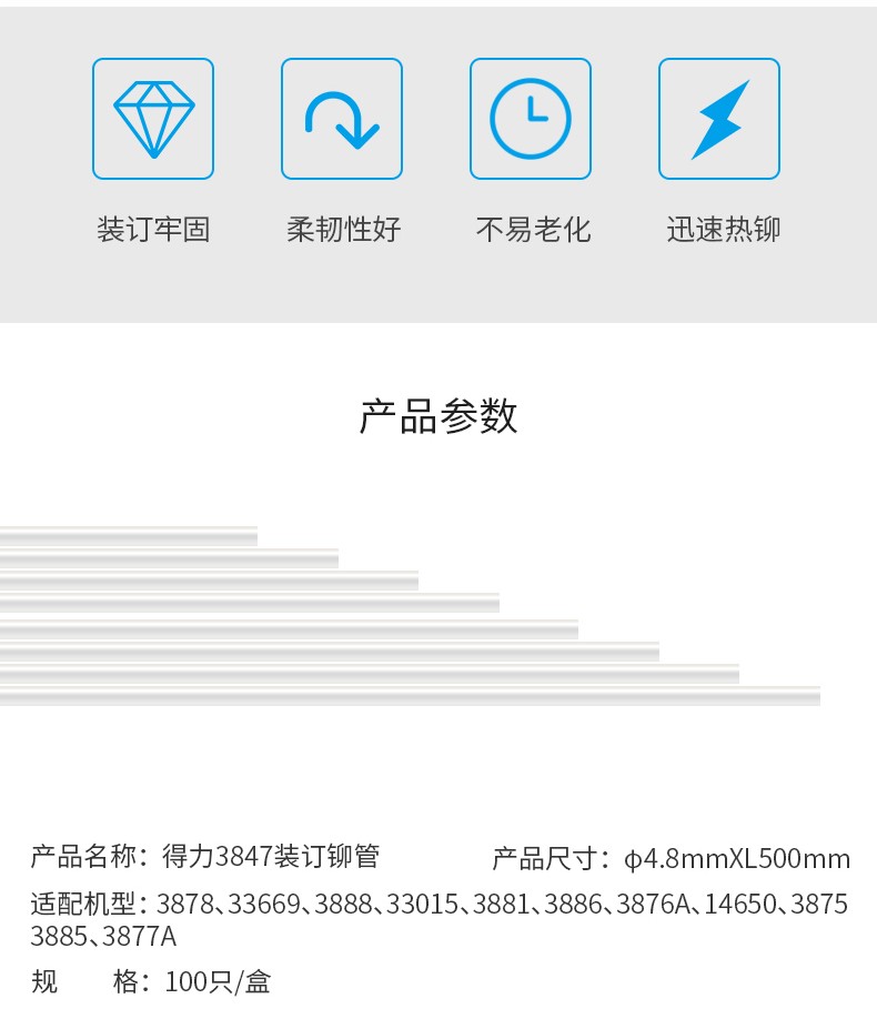 得力财务凭证装订机配套透明尼龙铆管 热熔胶管装订管塑料管耗材 100支/盒 3858(φ6*500mm)