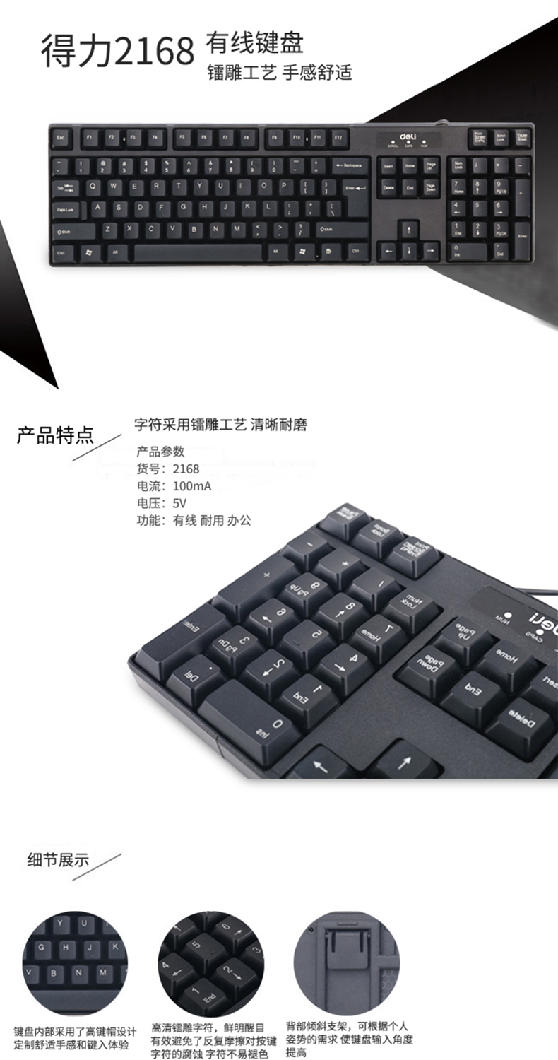得力 deli DL2168 USB键盘 游戏键盘 防水薄款 2168黑色