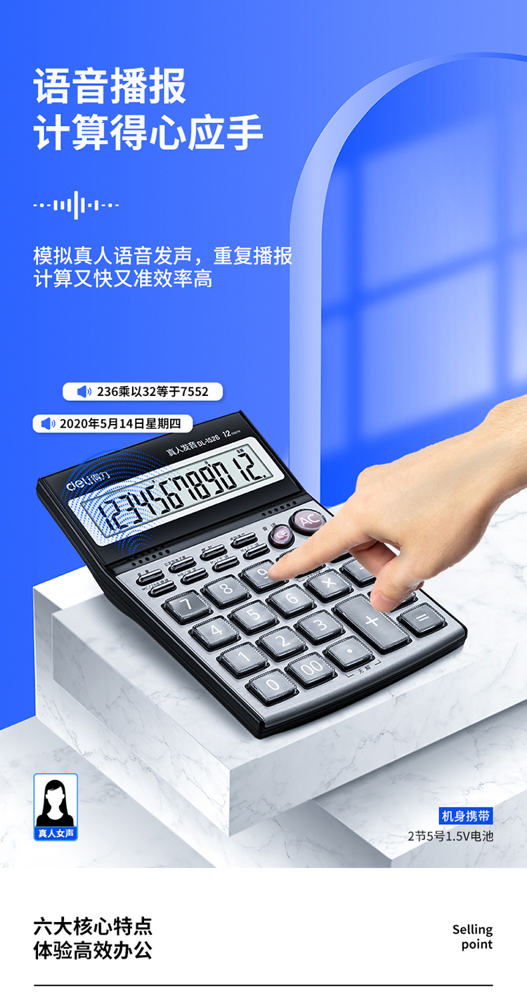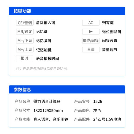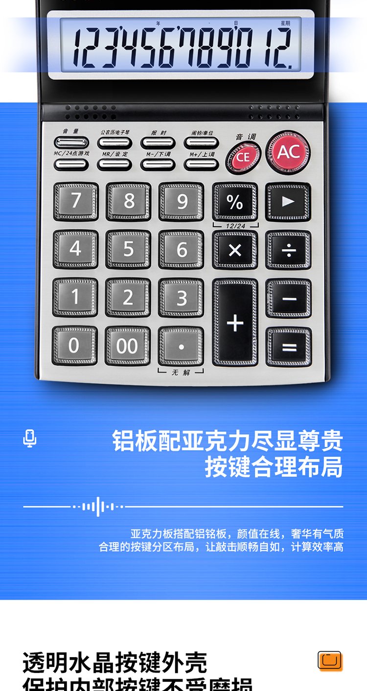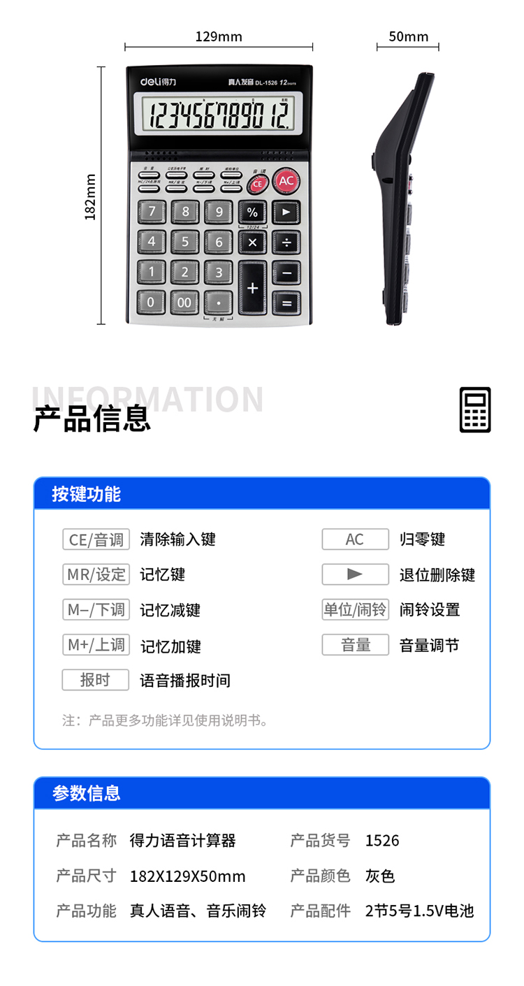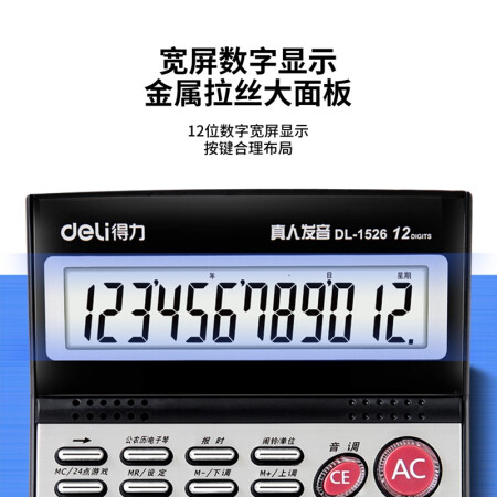 得力 deli DL1526 电子计算器 水晶按键12位语音计算器 闹铃功能语音计算机 格调灰