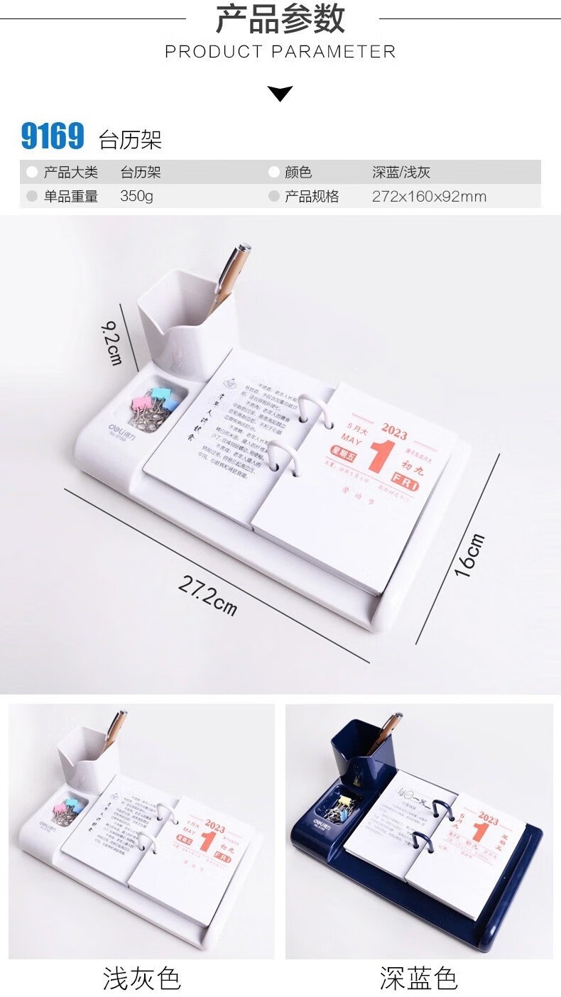 得力9169塑料制品 台历架创意日历架办公多功能桌面台历不含台历芯,带笔筒和回形针盒